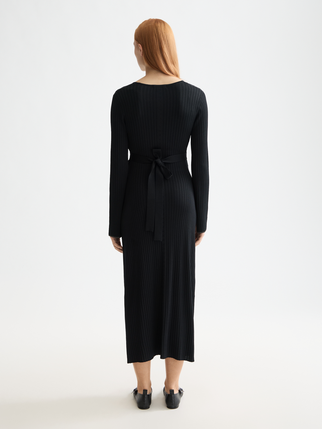 בגזרה צמודה, עם מפתח וי, שרוולים ארוכים, בשילוב חגורת מותן הניתנת לקשירה בגב או בחזית.
