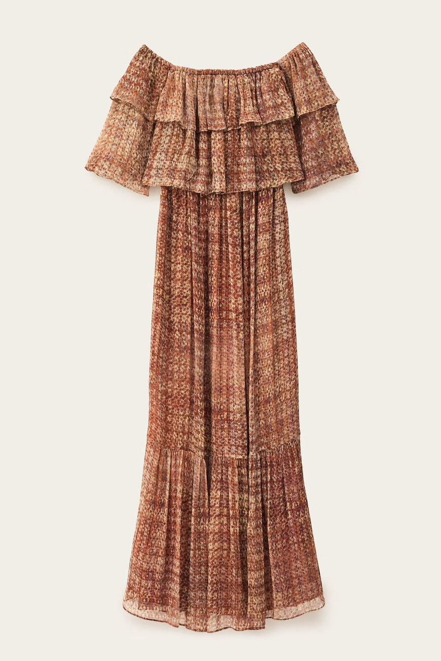 בגזרת סטרפלס בוהו משוחררת, עם שרוולים ארוכים נפולים.