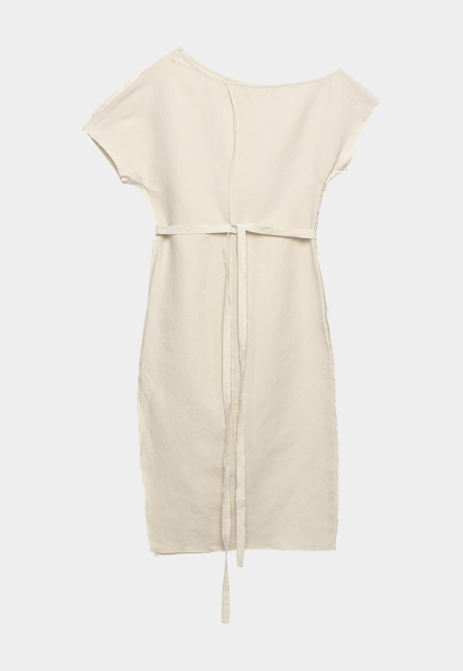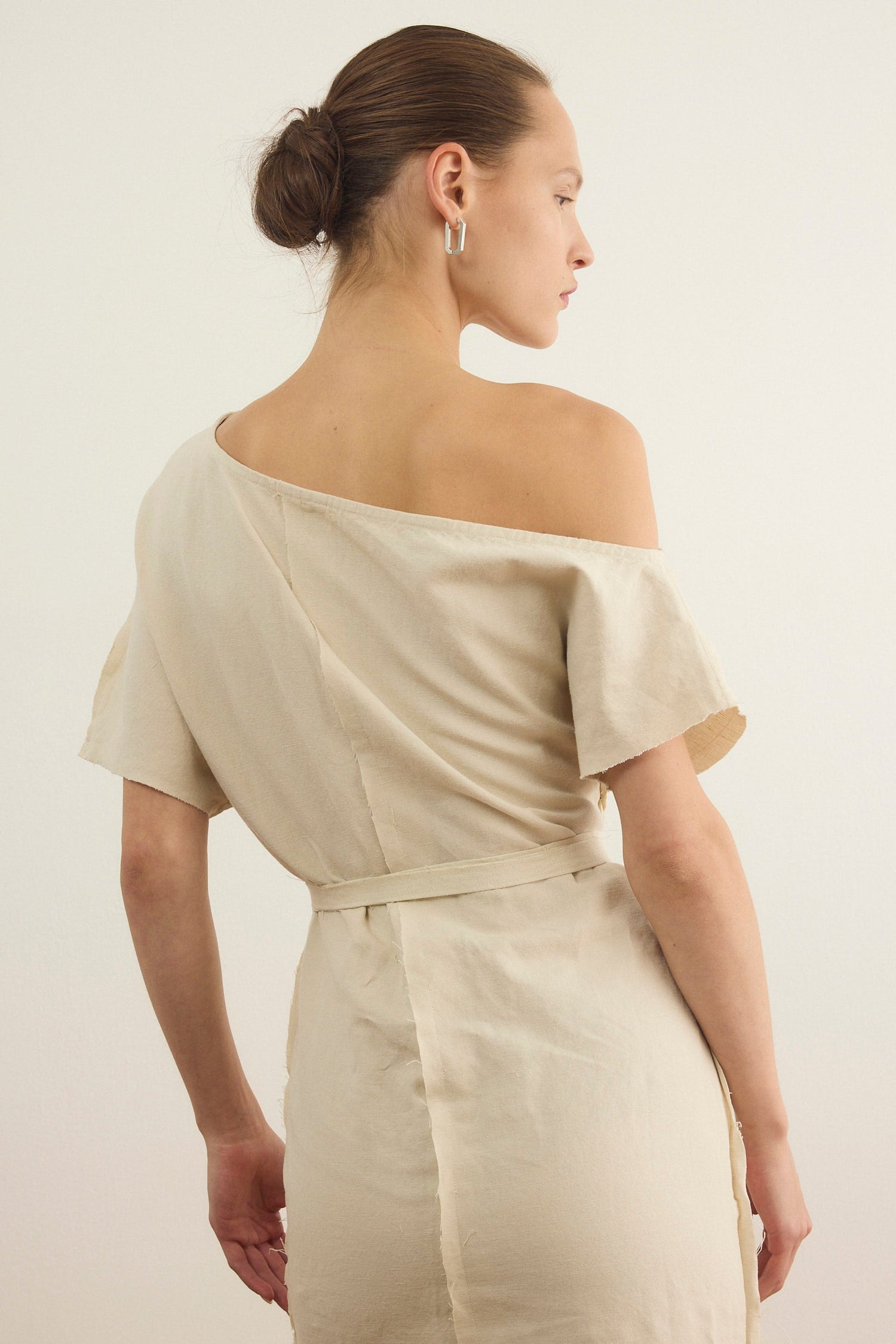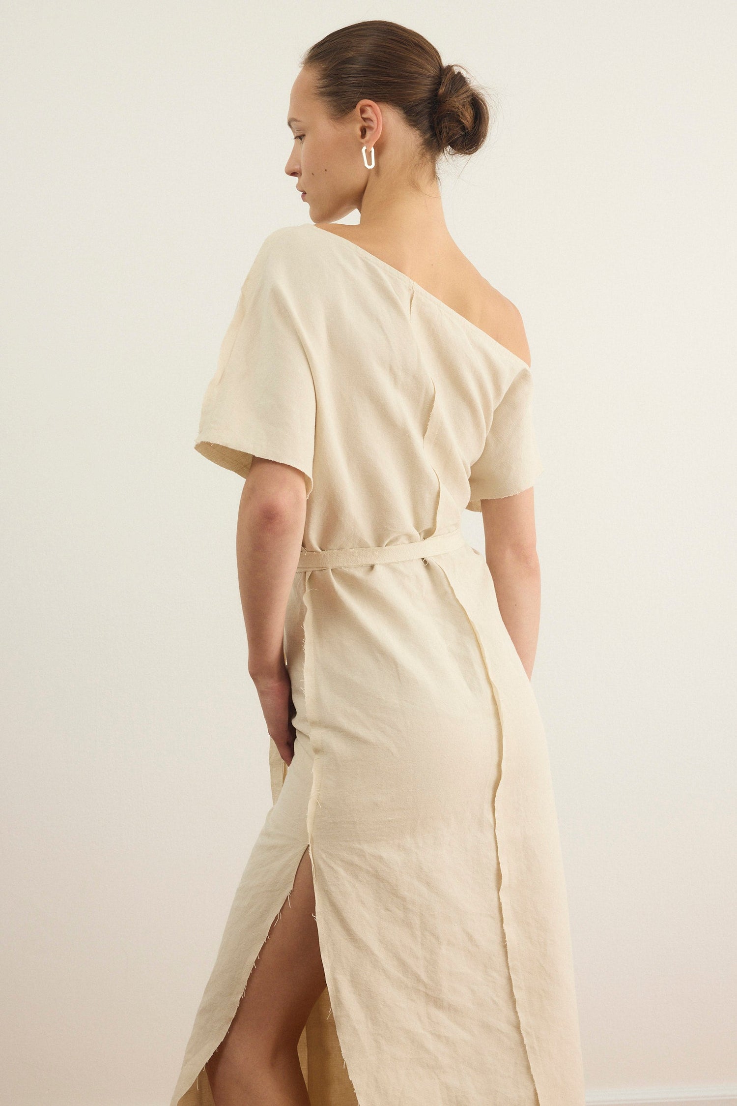 שמלת מידי אסימטרית בגזרה צמודה עם קשירה במותן ושסע בתפר צד ודיטיילס פרימות בסיומת, עשויה מבד פשתן נעים וקייצי.